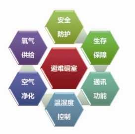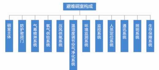 避難硐室設(shè)置在式煤礦井下適當位置,配備有維持人員生存所需的相關(guān)設(shè)備設(shè)施和食物、水等,為保證煤礦災(zāi)害發(fā)生時,給無法撤離災(zāi)區(qū)的遇險人員提供生命保障的空間。避難硐室與礦井安全監(jiān)測監(jiān)控、人員定位、壓風自救、供水施救、通信聯(lián)絡(luò)等系統(tǒng)相連,形成井下整體性的安全避難系統(tǒng),主要由防爆密閉系統(tǒng)、氧氣供給系統(tǒng)、通訊及人員定位系統(tǒng)、監(jiān)測監(jiān)控系統(tǒng)、環(huán)境控制系統(tǒng)、照明系統(tǒng)、生存保障系統(tǒng)組成。